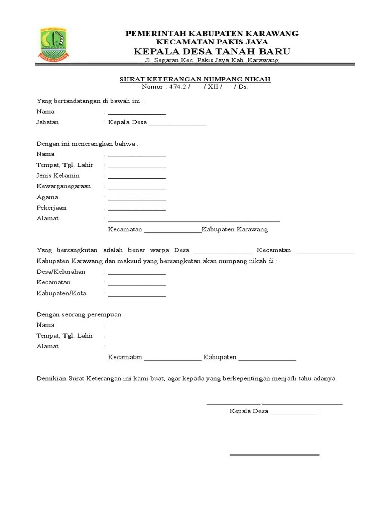 Nikah ke keluar daerah, atau yang biasa disebut surat keterangan numpang nikah surat keterangan nikah dari desa. Surat pengantar pindah dari kepala desa;
